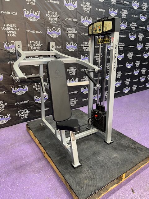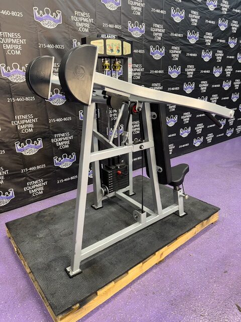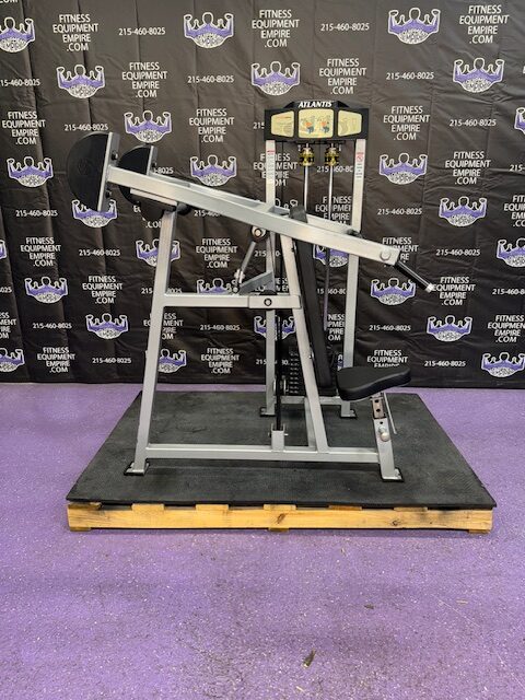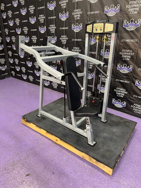 Atlantis shoulder press in super clean condition. Atlantis makes some of the best commercial equipment in the world and this machine is one of them. Kevlar belt driven, extremely smooth and well-built. This machine mimics the feel of pressing dumbbells overhead but is much safer and just as effective. This unit is in stellar condition.