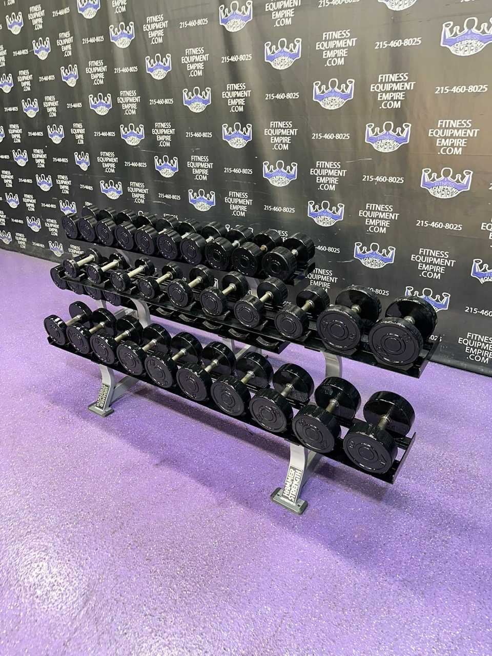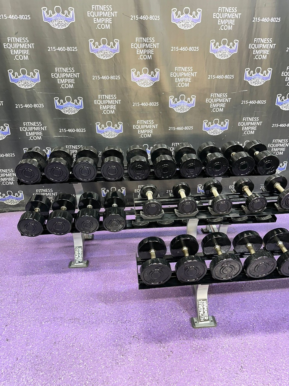 5-125 Lb w / Extras Hammer Strength Urethane Dumbbell Set - Like New. These are some of the highest end and most expensive dumbbells on the market. They sell for as much as $7 lb elsewhere. We are asking a fraction of that. Racks not included.