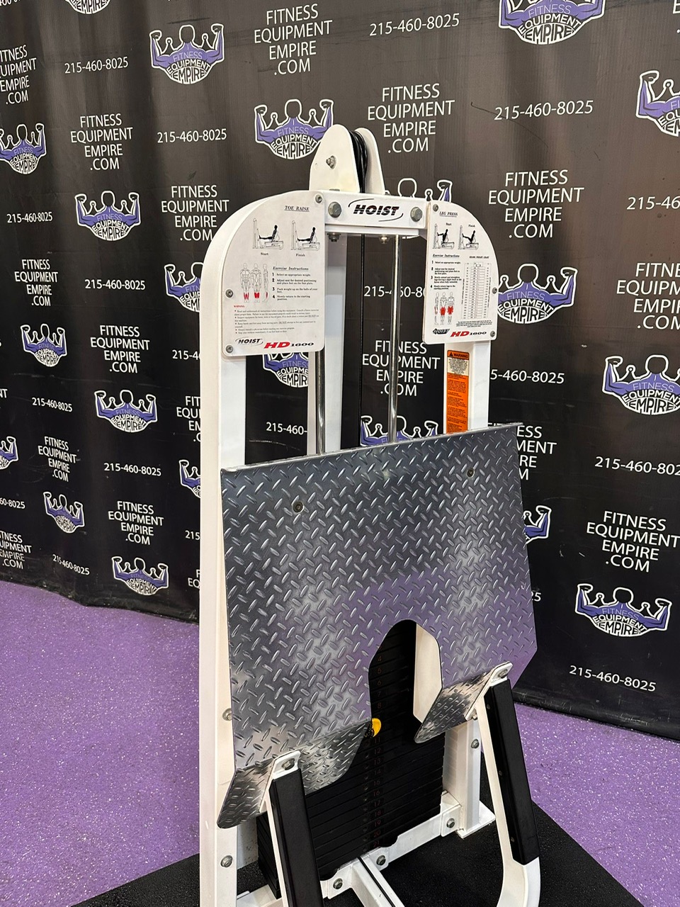 Hoist HD 1600 Leg Press w / 420 Lb Stack & Huge Footplate. The large footplate allows various foot placements, allowing you to train all muscles of the legs such as quads, hamstrings, glutes and calves. Unit is refurbished and in stellar condition.